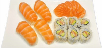 4 sushi saumon , 4 sashimi saumon , 6 california saumon
