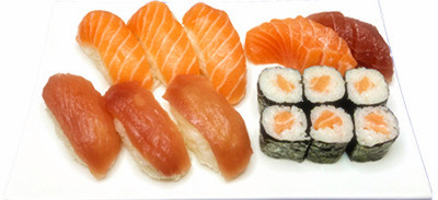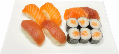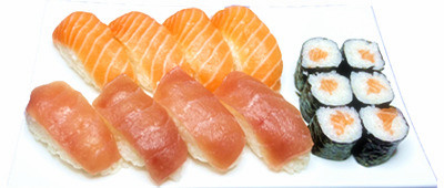 4 sushi thon , 4 sushi saumon , 6 maki saumon