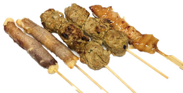 (1 brochette poulet , 2 boulettes de poulet , 2 bœuf au fromage , 1 riz)