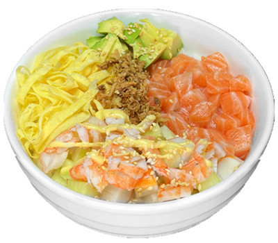 Saumon , surimi , crevettes , avocat , concombre , omelette , sésame , oignon frit , riz vinaigré